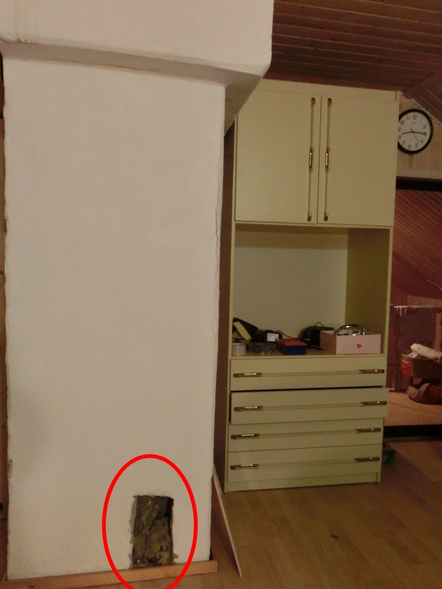 Через второй этаж загородного дома проходит дымоход активно используемой печи. В самом низу дымохода разположено вентиляционное (?) отверстие.