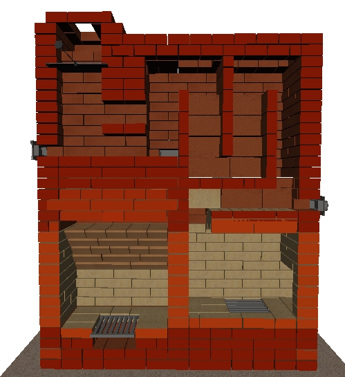 еще одно . Камин , судя по всему , работает на глухом поду . Колосники абсолютно лишние , так как , воздух для шорения поступает через проем топки . И по поводу футеровки - согласен с прндыдущим автором . Возможно , имеет смысл делать обе топки одним блоком из огнеупорного кирпича . Ситуация позволяет . С Уважением.