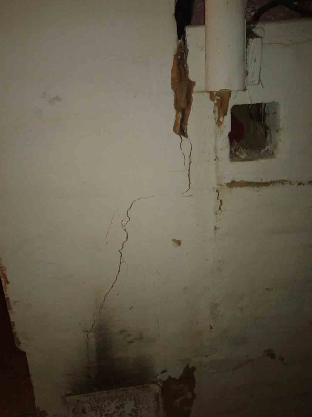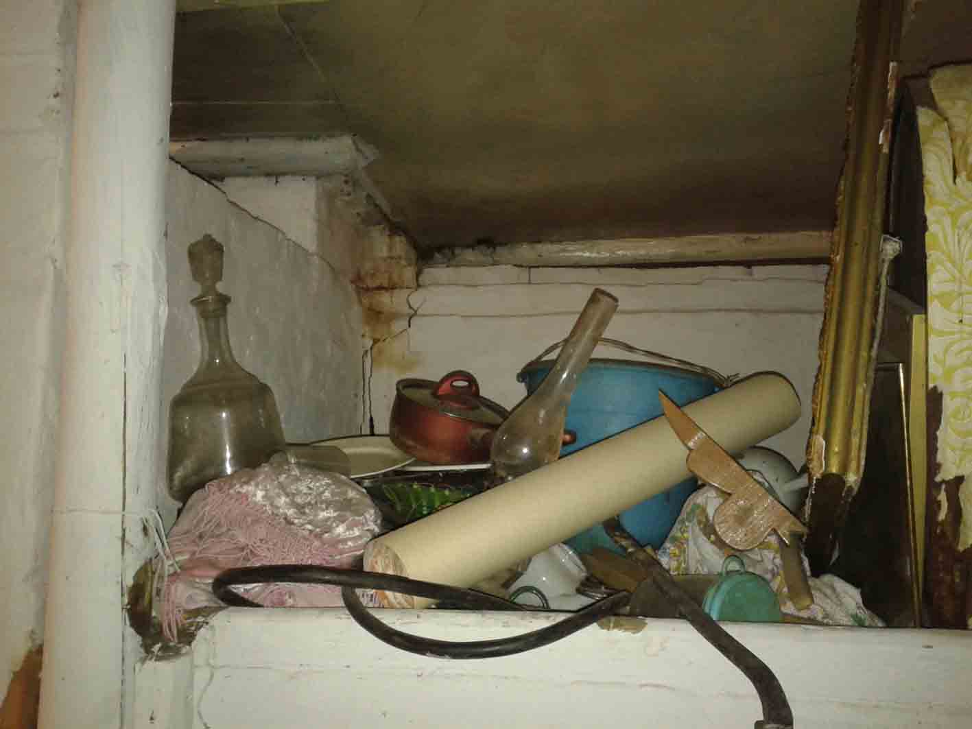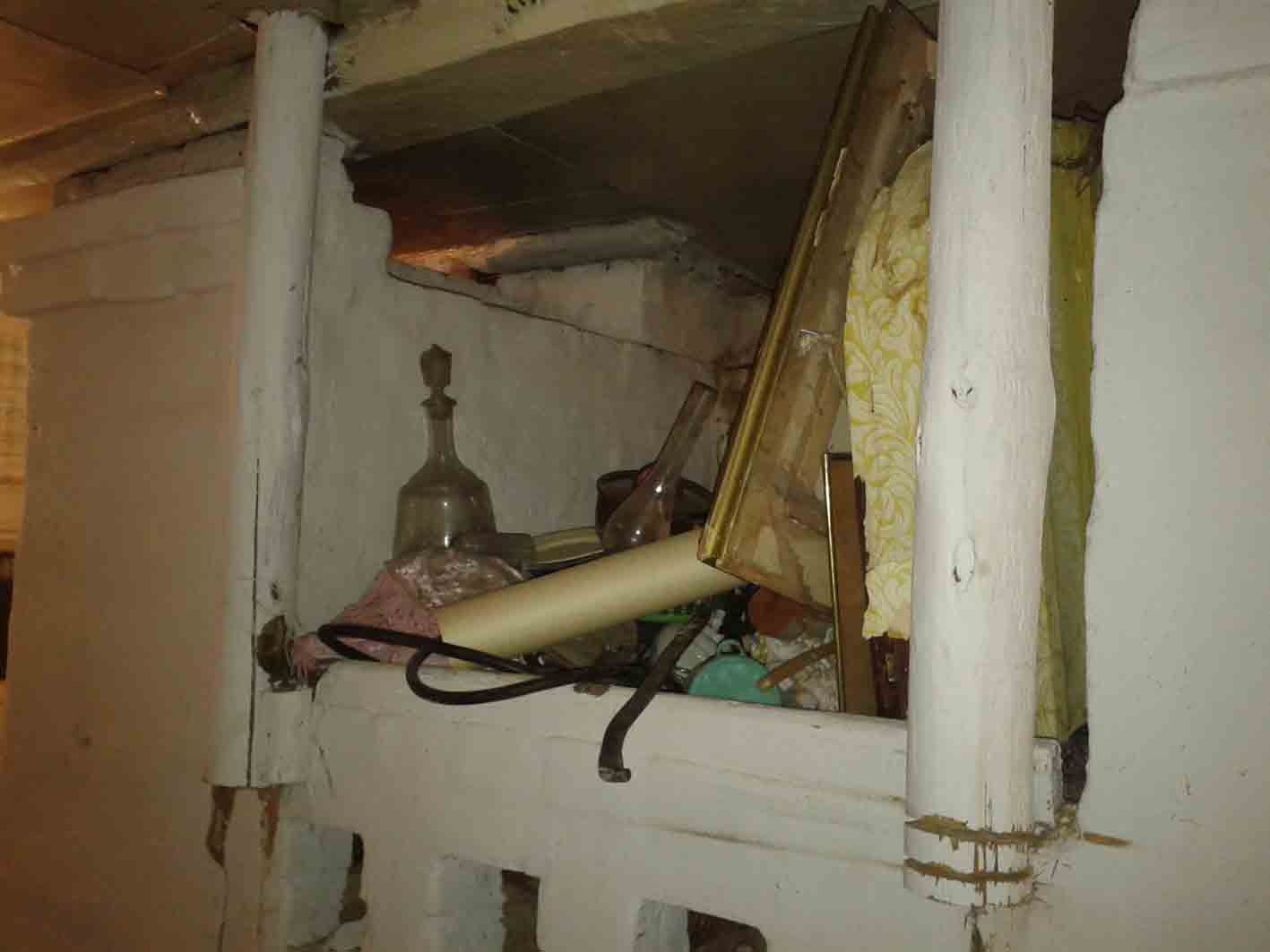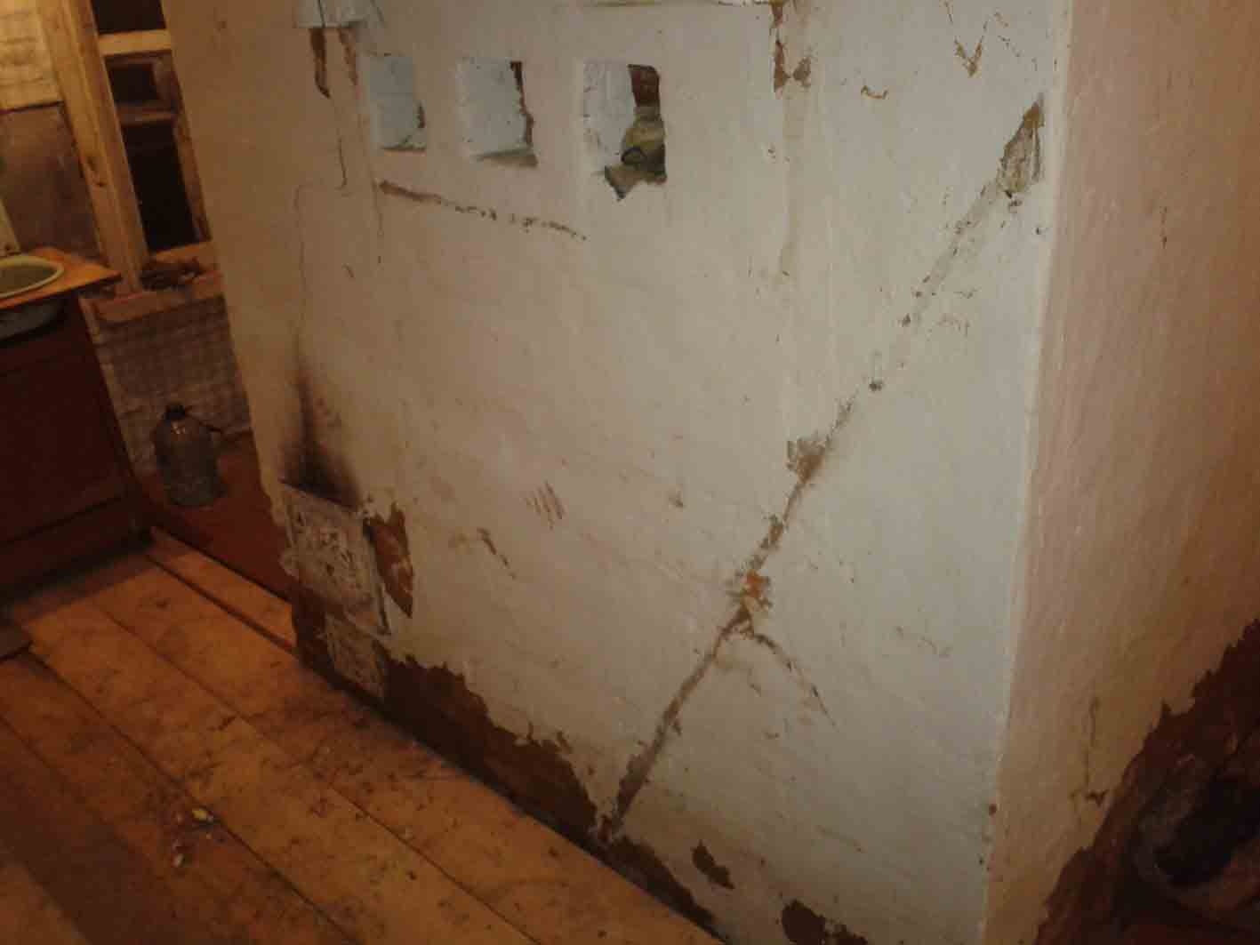 Дом 1930 года постройки, Серпуховский район, Московской области. Печь того же времени. Печь уже ремонтировалась прежним владельцем. При замене венцов сруб видимо накренился и потянул за трубу - печь треснула в нескольких местах.