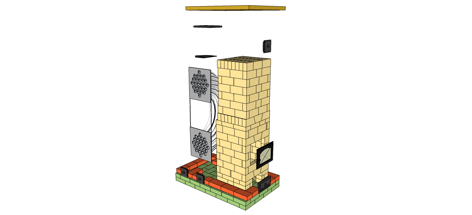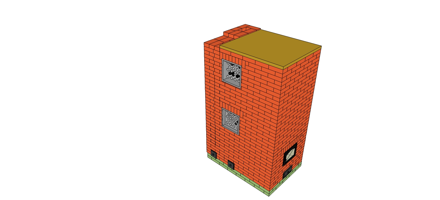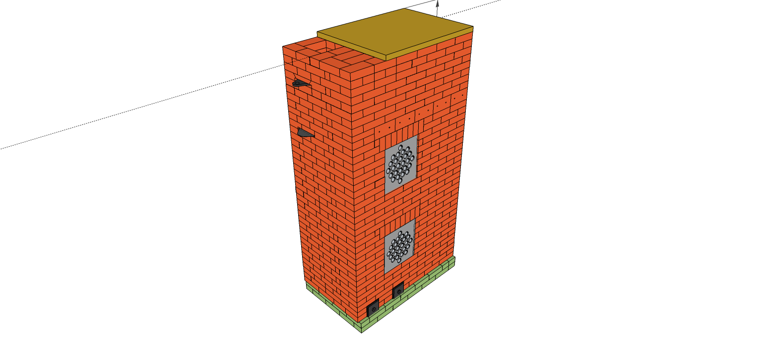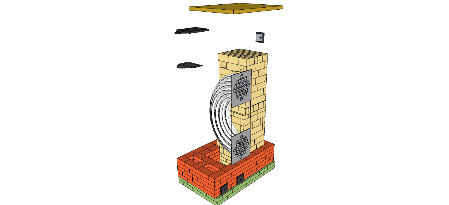 В проекте не показан аксиальный вентилятор (объём проходящего воздуха будет регулироваться также в зависимости от температуры), который будет закреплён на нижнем фланце стального теплообменника. Для его устойчивого расположения выложена кирпичная полочка в полтора кирпича с 1 по 14 ряд на противоположной стенке (форма труб, вероятнее всего, будет немного иная, и к ним будет приварены необходимые для установки кронштейны). С верхнего фланца будет осуществляться подача горячего воздуха к системе разводки стальных воздуховодов (диаметр труб от 250 до 170 мм).