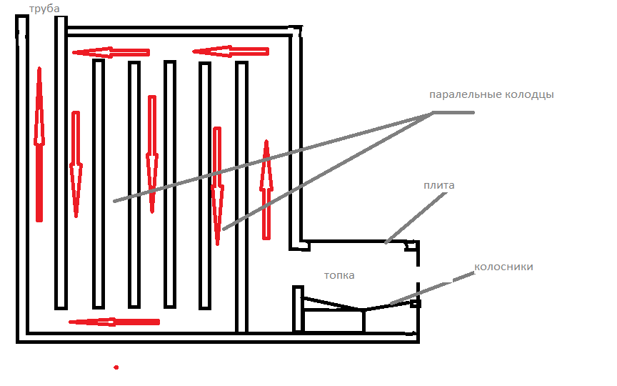 обычный противоточный щиток.Всё будет работать нормально, просто верх прогреется лучше чем низ ну и последний канал в трубу будет еще холоднее. Первый подъемный канал лучше сделать побольше по отнош.к остальным . это просто схема и соотв.размеры будут конечно другие