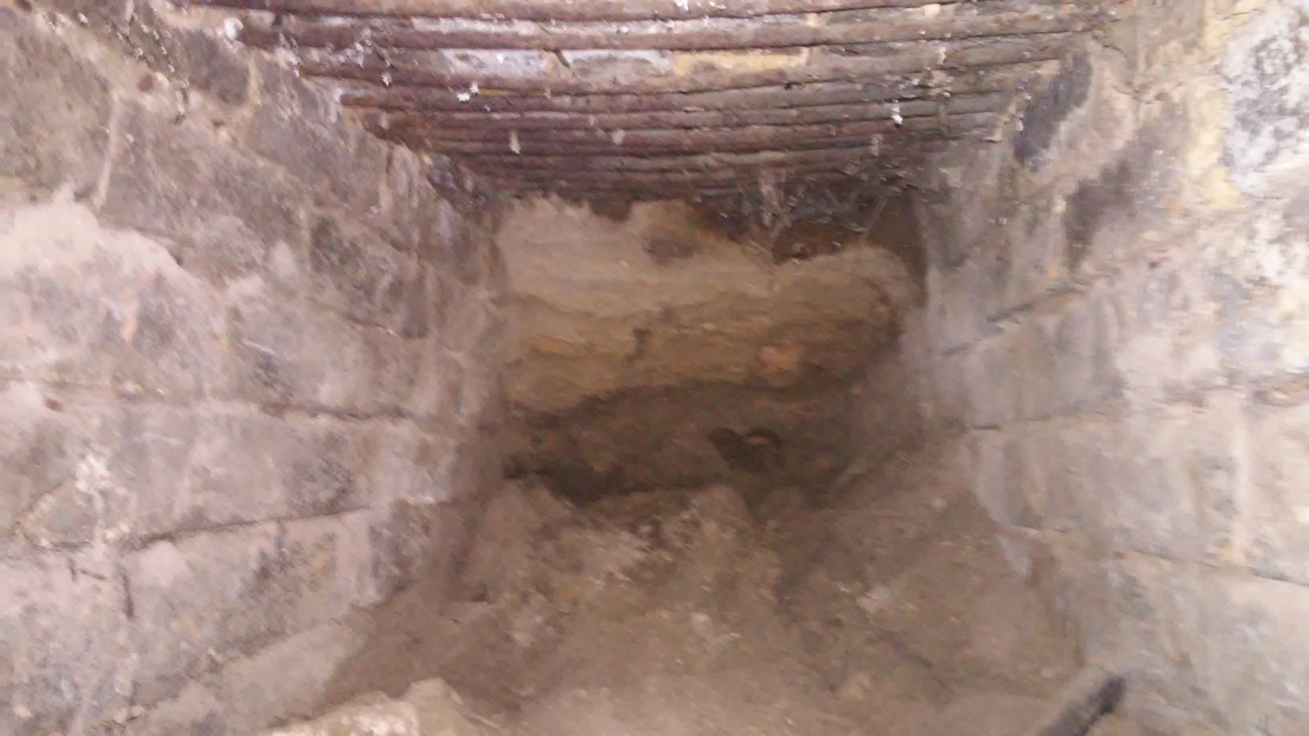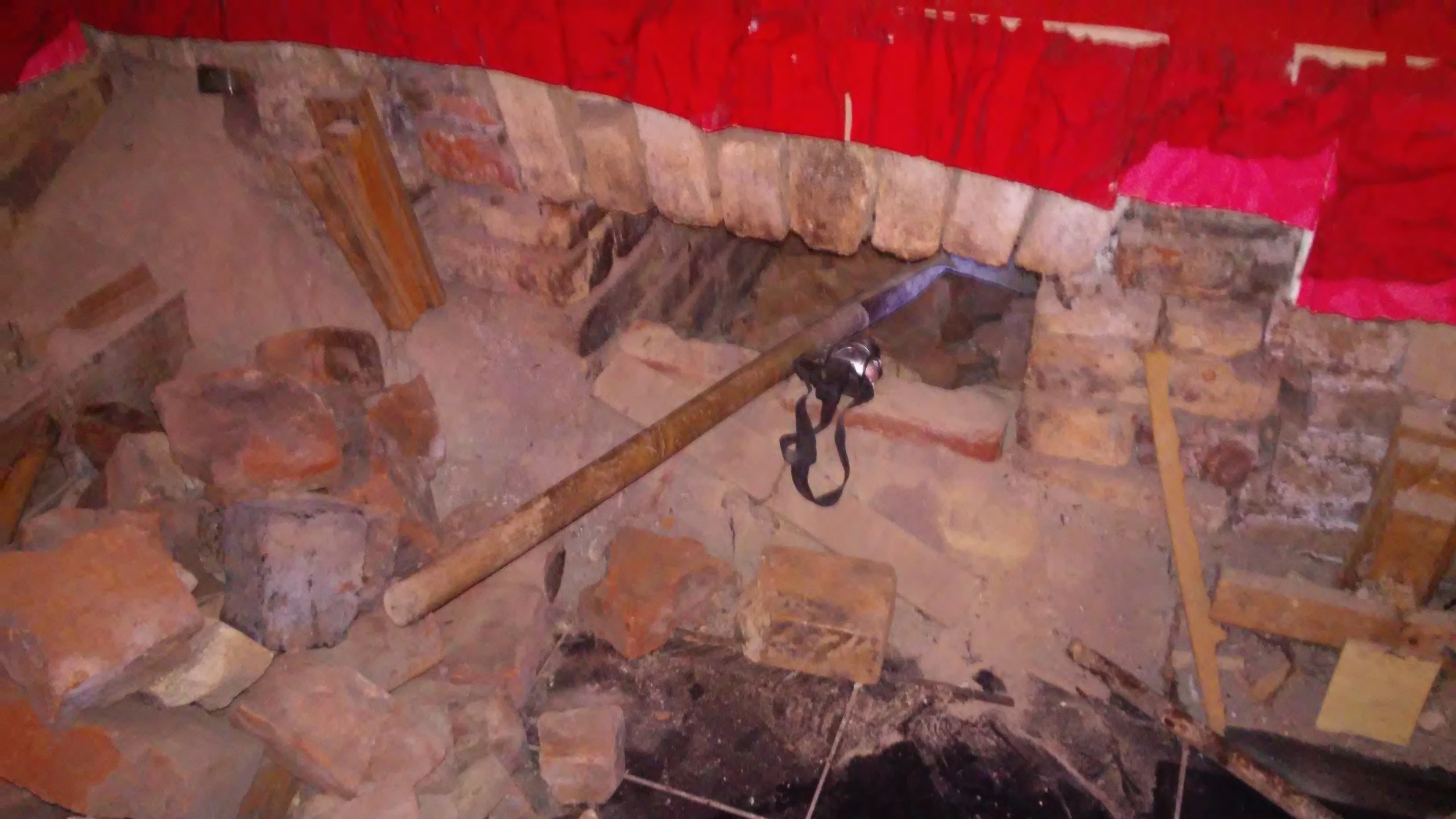 Печка на цокольном этаже ведущая в трубу по видимости. Очистил её от сажи, земли и завалов кирпичей, в глубь почти на 2 метра но сквозного входа в саму трубу не нашёл. Дальше только рыхлая земля. Хотел в это отверстие трубы для вытяжки вывести