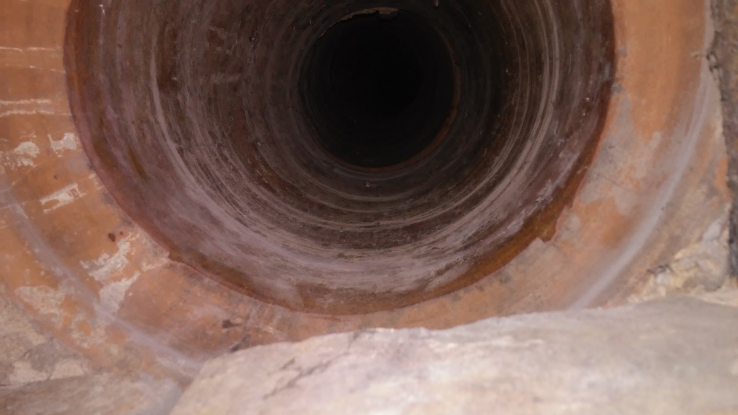 Я нашёл только эти два отверстия в райне трубы! Печка по идей прямо на против трубы и соответственно идёт в неё, толщину стены до трубы я миновал(вычестил), дальш упора в трубу нет и пустоты которая по идее в трубе должна быть, тоже нет, в ней рыхлая земля. Не понятно куда идёт керамическая труба, с верху рядом с трубой внутри стены. По идее, что бы не чистить основную трубу может вытяжку пустить в маленькую керамическую? Но я не знаю куда она идёт дальше (может прямо в квартиры), не пойдут ли выбросы от вытяжки по квартирам . С неё поддувает и под ней было много костей птиц.