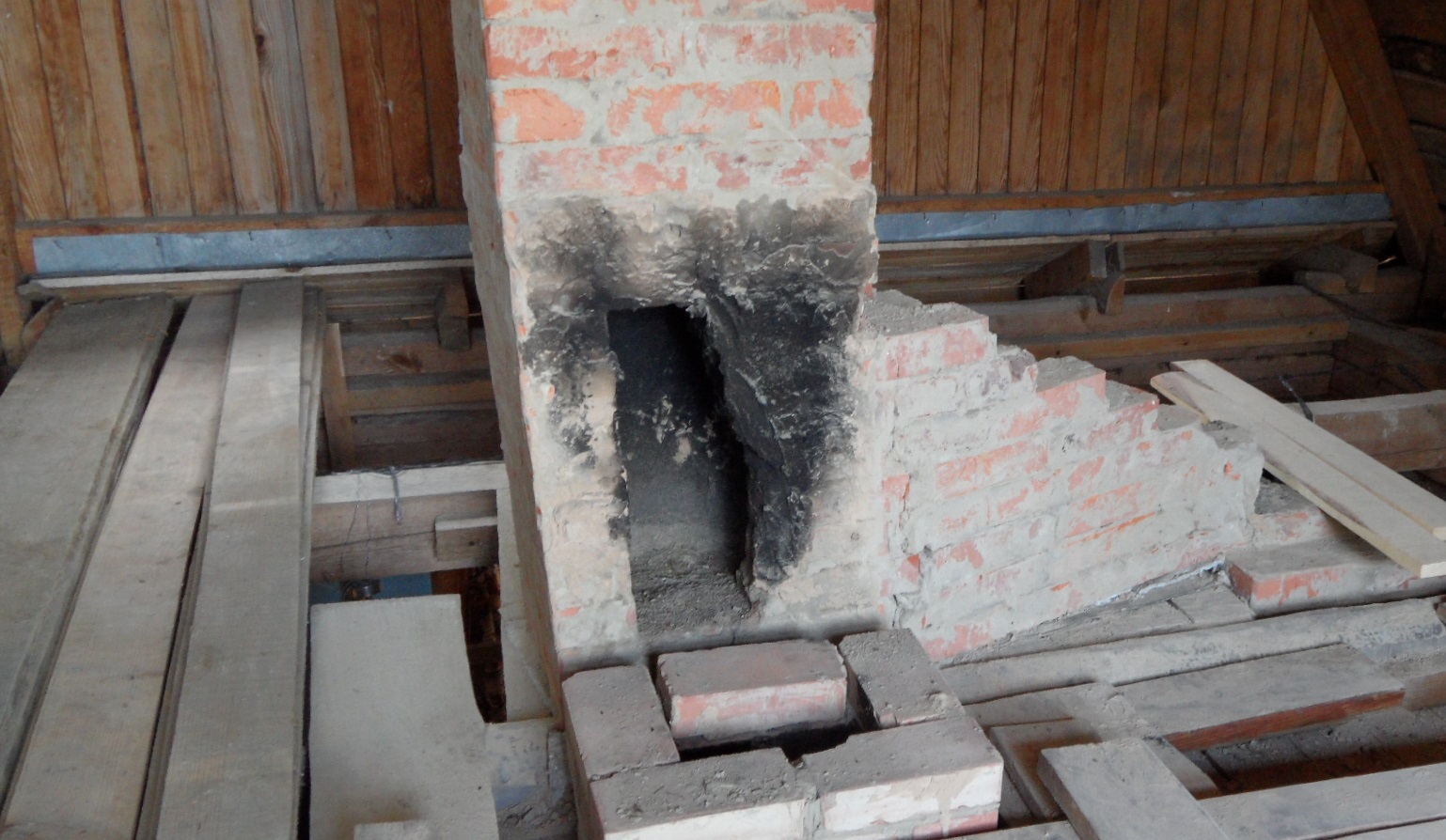 Приобрели дачу, имеется печь и камин (в разных помещениях, на отдельных фундаментах). Дымовая труба выносная, стоит на дубовых досках с опорой на поперечные балки, высота не менее 10 м. Входы в трубу от печи и камина под 90 гр. (фото). После покупки заделывали вход от камина в трубу (был разрушен), но снова пошли трещины. Сейчас разобрал от входа и прошу совета в части того, что делать оптимально, так как местные мастера говорят кто, что (гильзовать входы, делать отдельно трубы кирп., ставить сендвич).