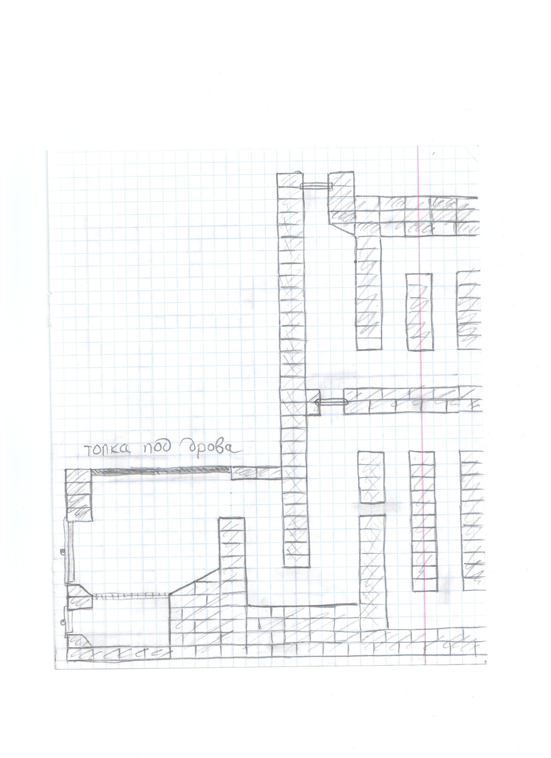 Я сложил в гараже (размер гаража: площадь 45 м2 потолок 260см*285см(наклон к воротам) яма 10м3 открытая, стены в кирпич (марка ШБ5), перекрытия деревянные, в дальнейшем стены и потолок будут утеплены) печь прямоугольную отопительную типовую, ее схему привожу ниже размер соответственно 5,5*2кер.