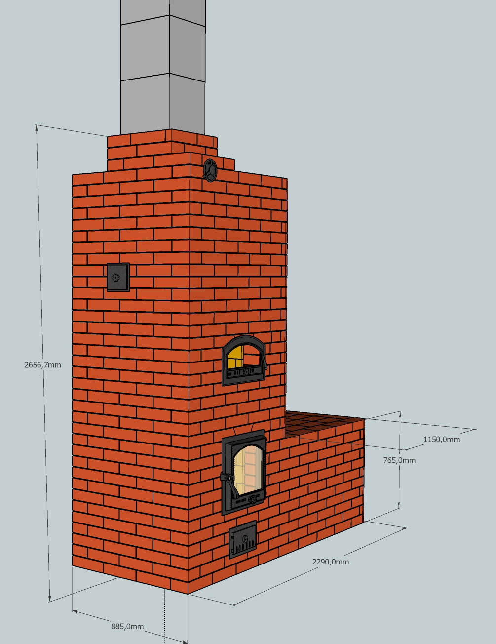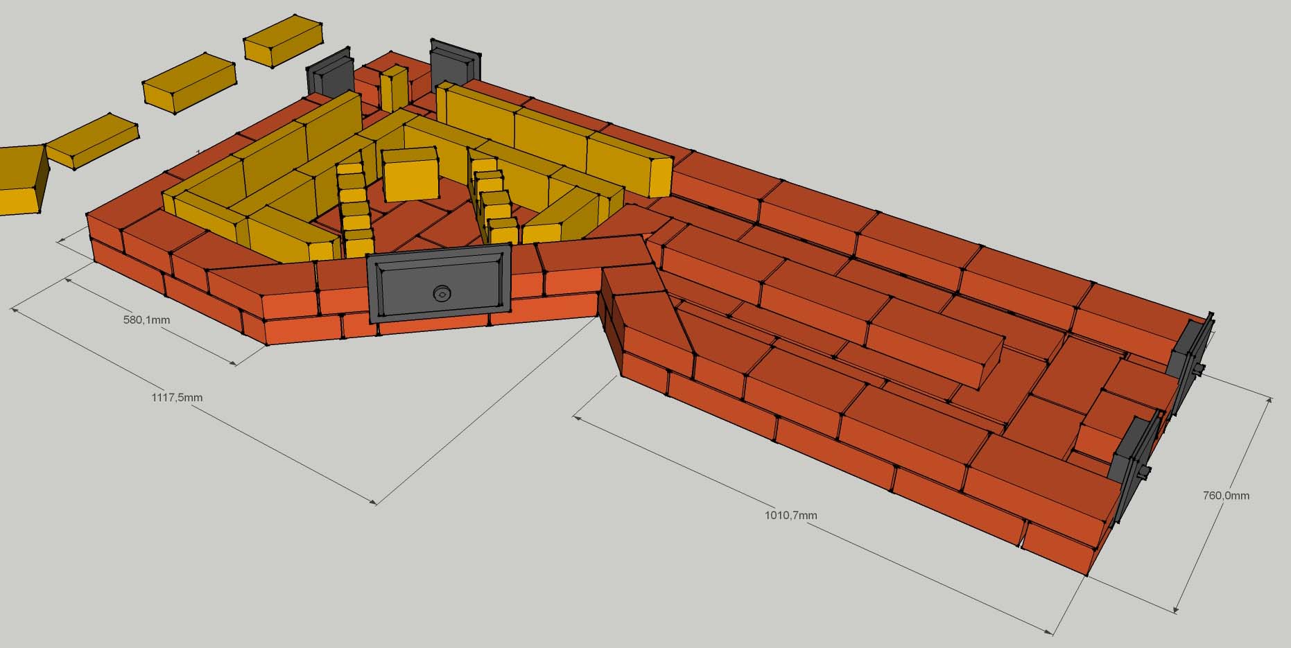 Фундамент был подготовлен под печь ОВИК-15Л, но пока шло строительство захотелось установить каминную дверцу и хлебную камеру вместо плиты. Попытался сделать проект печи, но сразу уперся в проблему, что не получается обеспечить симетричное движение газов. Такие конструкции вроде делают, но описания и порядовок не нашел, хотя возможно плохо искал.