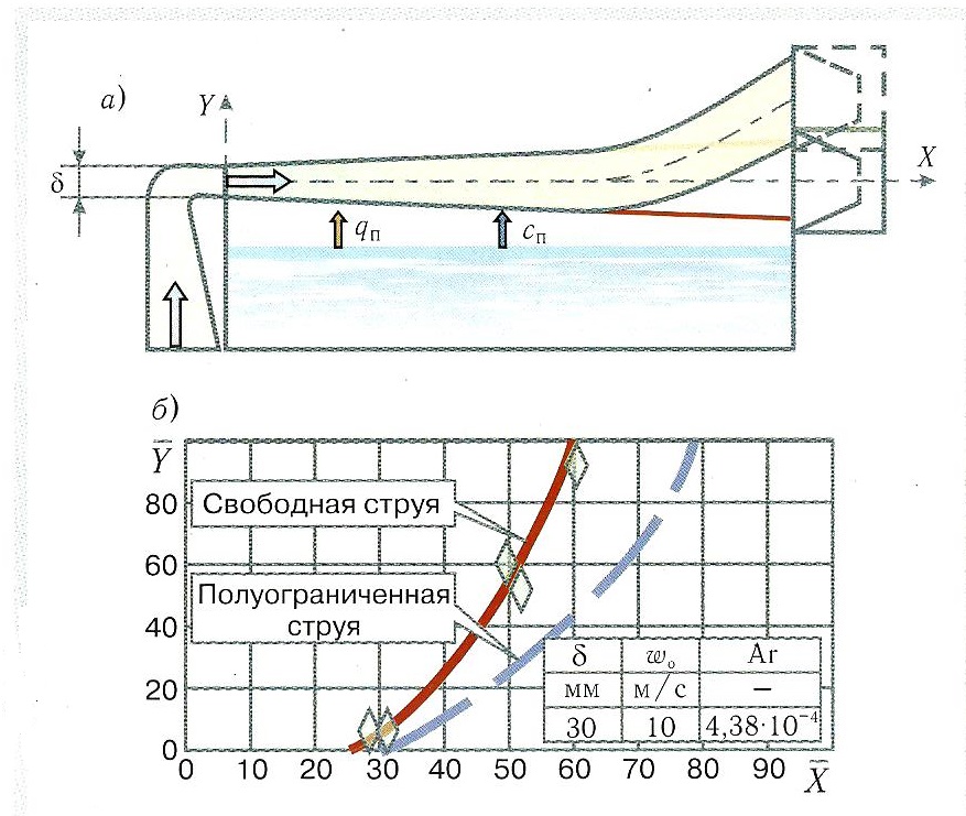 Это увлечение окружающего газа сильно тормозит струю. Поэтому, если струя идет вдоль по поверхности, она (хоть и тормозится трением), но не цепляется за неподвижный газ с увлечением. И такая струя полуограниченная имеет большую дальнобойность, чем струя, совсем не ограниченная поверхностями (то есть свободная). Это приводит к эффекту Коанда.