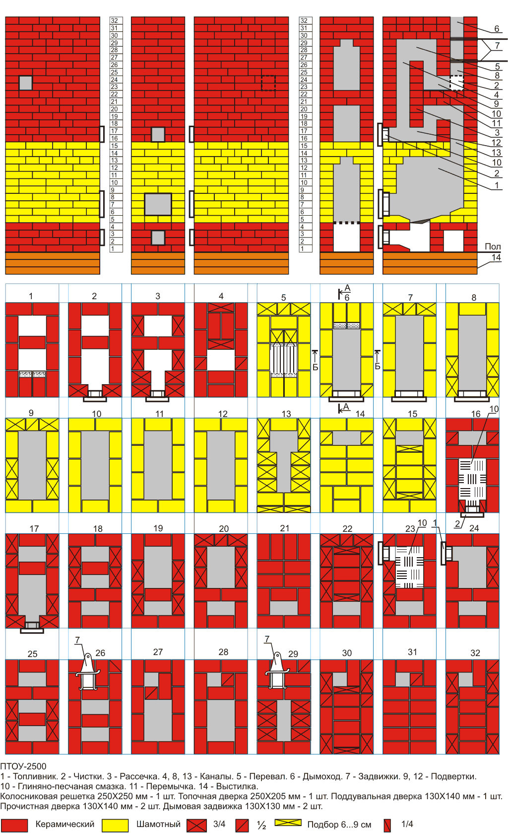 Уважаемые мастера, прошу помощи в изменение порядовки печи ПТОУ-2500. Хочу изъять из конструкции печи 26 ряд. Как строить после 25 ряда? Может ли кто помочь с порядовкой, с её изменением после 25 ряда? Форум читаю давно, всё вроде бы понял (пока), а вот рассчитать дальнейшую кладку не могу, поэтому и зарегистртровался с надеждой на помощь. Спасибо. Да, может кто есть из Мордовии, печники, не подскажите, какой у нас лучше приобрести кирпич (керамический)?