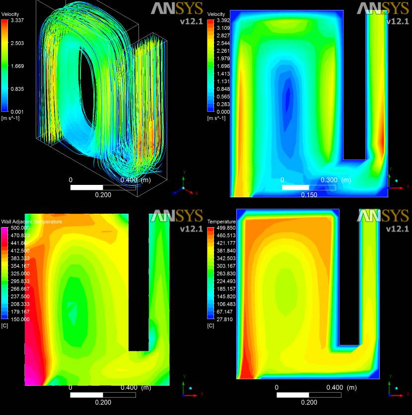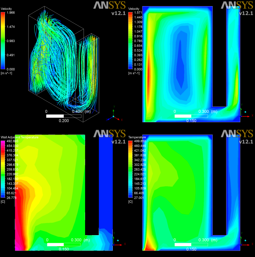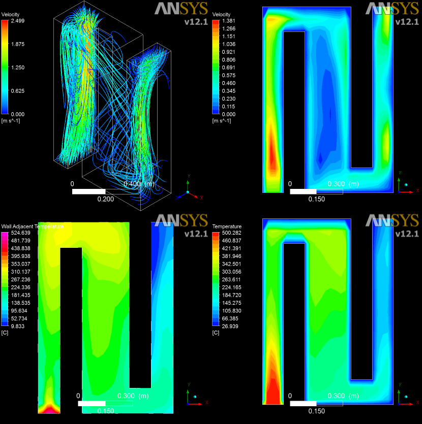 Специально для mvovec показаны направление движения и скорость воздуха, температура на внутренних стенках и температура воздуха в разрезе по центру полостей.