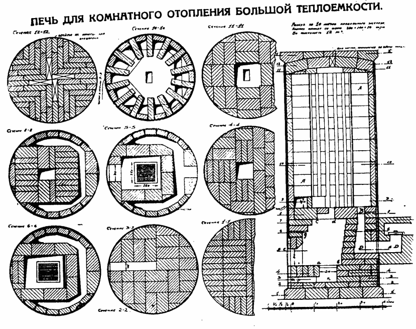 "Устройство печи таково: из хайла CD пламя топочных газов вступает в общую камеру АА, выложенную в железном барабане в 1/4 кирпича. Чтобы дать устойчивость этой камере, ее стенки подкреплены 14-ю контрфорсами в 1/4 кирпича, увеличивающими поверхность нагрева печи до 12 кв.метров при диаметре почти в 1100 мм. Пламя из хайла летит пряно к своду печи, опрокидывается им и нисходящими струями вдоль наружных стенок совершенно равномерно спускаются вниз в общий сборный канал ВВ, по которому печные газы собираются к дымовому борову ДД. В дымовом борове находится вьюшка с обыкновенным блинком, а лучше заслонка в форме задвижки.