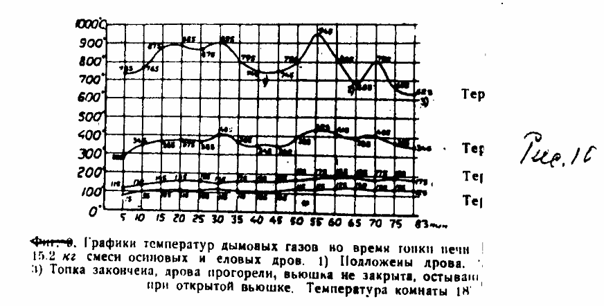 Остывание печи 31 декабря /рис. 14/ происходило при закрытой, но неплотной жестяном вьюшке, 4 января /рис. 13/ при открытой вьюшке; только 2 февраля /фиг. 15/ и 3 февраля /фиг. 15/ вьюшка была заменена плотной чугунной вьюшкой. Характер прогревания печи и остывания можно проследить по графикам, относящимся к испытанию 3 февраля /фиг. 15/. Из этих графиков видно, что от 15,6 кг дров наружная поверхность печи нагрелась до 52-82°С и что через сутки после начала толки наружная температура печи была еще от 28 до 35°С, т.е. полные сутки печь была теплая.