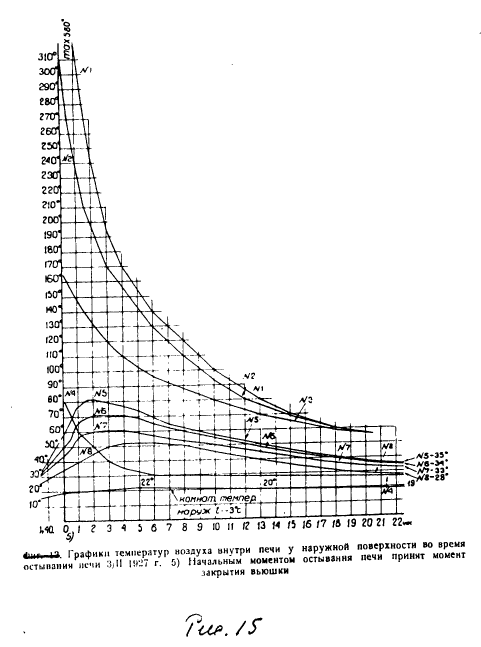 Остывание печи 4 января 1927 года /рис. 13/ происходило при открытой вьюшке. В то время как температура термометра № 1 резко упала в течение первого часа остывания, термометр № 2 остывал гораздо медленнее, и еще через 18 часов остывания печи термометр № 2 показывал температуру 45° при открытой вьюшке. Из сравнения графиков температур термометров №№ 5, 6, 7 и 8, при остывании печи 4 января, при открытой вьюшке и 2 февраля при закрытой вьюшке видно, что термометры № 5, 6, 7 и 8 показывают 4 января более низкую температуру, чем 2 февраля; кривая температур несколько ниже, но все таки имеет такой же вид, как и 2 февраля и не падает так резко, как температура термометра № 1. Несмотря на открытую вьюшку, термометр № 5 через 18 часов остывания показывал 27°, термометры №- 6, 7 и 8 - от 18 до 20°, а термометр № 2 внутри печи, как уже упоминалось, - 45°.