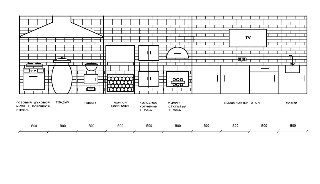 Замечание из практики насчёт тандыра (фото внизу). Над тандыром предусматривался самостоятельный дымосборник и дымоход. Оказалось, что дым мощно идёт в трубу, но недостаточно - сильное задымление в беседке. В итоге тандыр на улицу, а на его месте подвесили на уровне столешницы металлический камин-гриль.