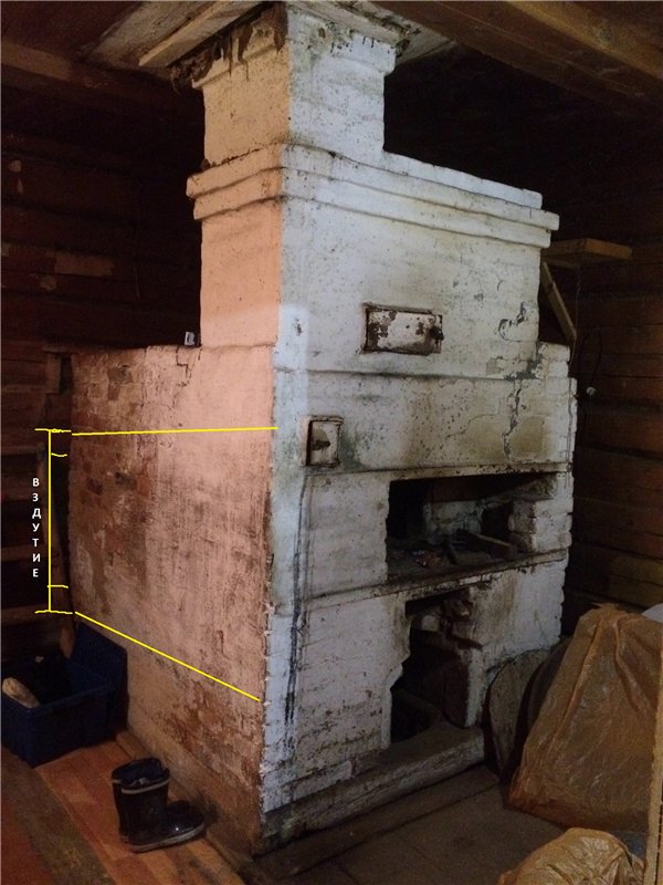 Каково состояние горнила и перетрубья? Вздутие суть просто неровная кладка. Трещины, возможно, замазать или переложить угол. Это навскидку. По фото больше не понять.